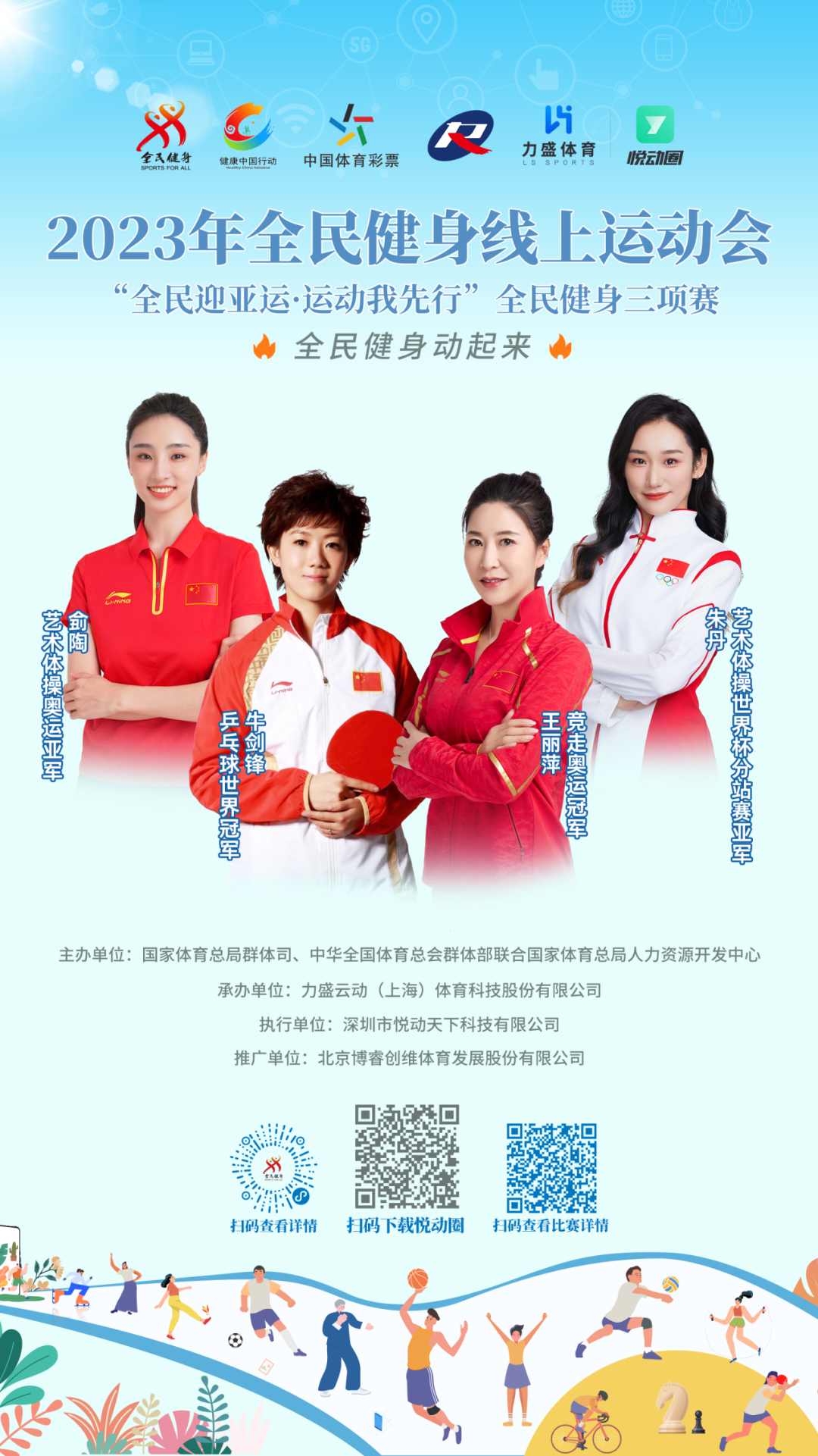 国家体育总局群体司、中华全国体育总会群体部联合国家体育总局人力资源开发中心主办,JBO官网云动(上海)体育科技股份有限公司承办,深圳市悦动天下科技有限公司执行的2023年全民健身线上运动会暨“全民迎亚运·运动我先行”全民健身三项赛(以下简称“三项赛”)将于8月8日“全民健身日”当天在“悦动圈”APP盛大开赛!