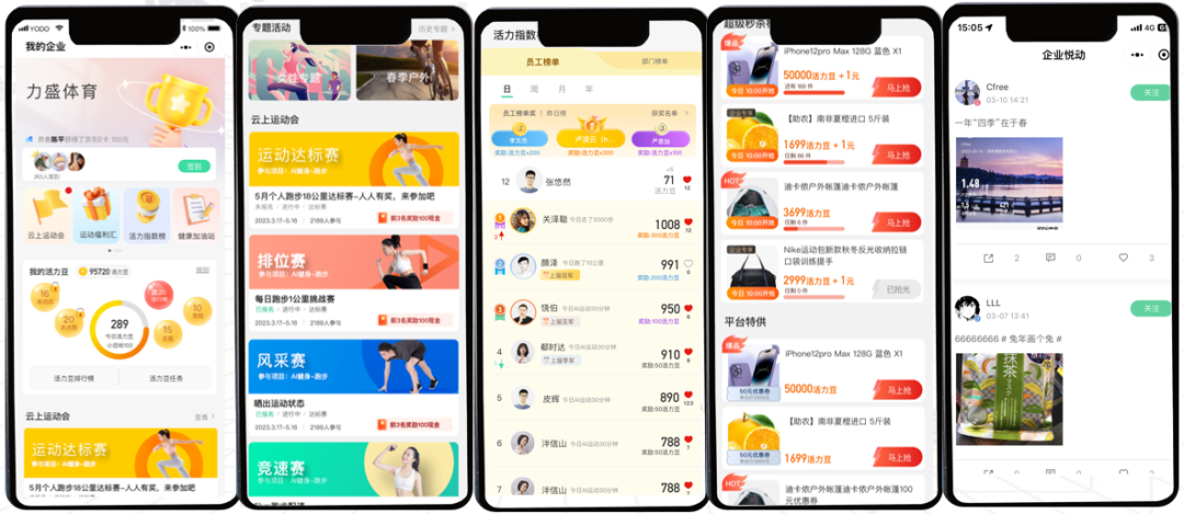 悦动圈历时6年,致力于打造智慧企业运动健康管理系统,通过互联网+运动思路,并充分结合大数据和AI智能检测,为各大企业提供服务。其智能企业运动服务管理可根据企业需求进行更多定制化的服务,包括企业运动管理、企业专属赛事以及企业文化建设。